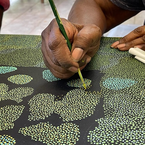 Many Artists paint outside on the ground, or on verandahs or the floors of open doored studios: dogs, birds, children and family in general mill around, dogs occasionally fight across a painting, and children, dogs (and the artists themselves) may frequently be found sitting on the artworks while they are in the process of being painted. This all makes it virtually impossible for an artwork to be painted in slow drying oils or fragile watercolour – it is definitely not the relatively controlled environment of a western artist. Acrylic paint is up to the test however, and it is a perfect medium for Aboriginal art – it is quick drying, durable, can be wiped clean, rolled, transported, endure harsh temperatures, and all without so much as a blemish or crack appearing in the work.
